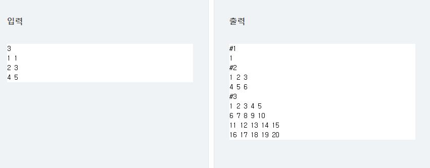 사각형의 높이 H와 너비 W가 주어지면 H행 W열의 사각형 모양으로 1부터 H*W까지 숫자를 차례대로 출력 하시오.