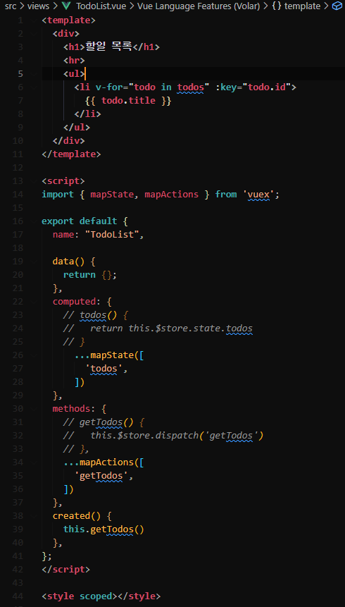 - 일단, store/index.js의 state에는 todo에 있는 배열을 사용하기 위해 computed에 함수를 적어준다.