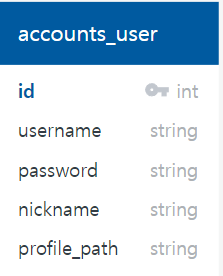 - profile_path : user의 프로필 이미지를 나타낼 수 있는 필드 (문자열로 이미지주소를 저장)