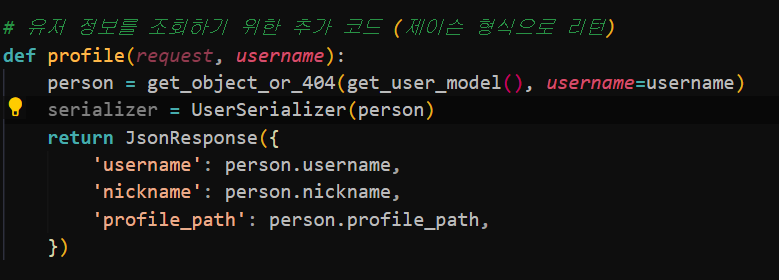 - 문제를 인식하고 accounts/profile/str:username이라는 url을 만들고 이 곳으로 get요청을 보내면 내가 원하는 정보를 json으로 리턴하게 한다.