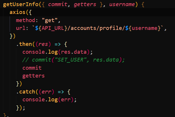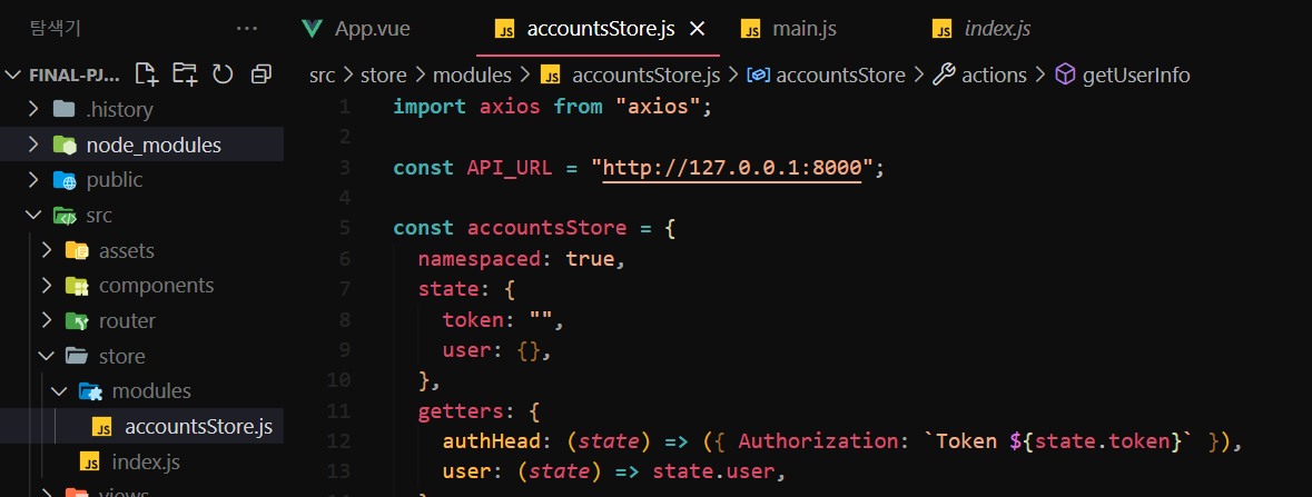 - store/modules/accountsStore.js를 만들어 유저 관련된 정보는 여기에서 다룬다.