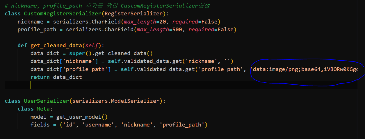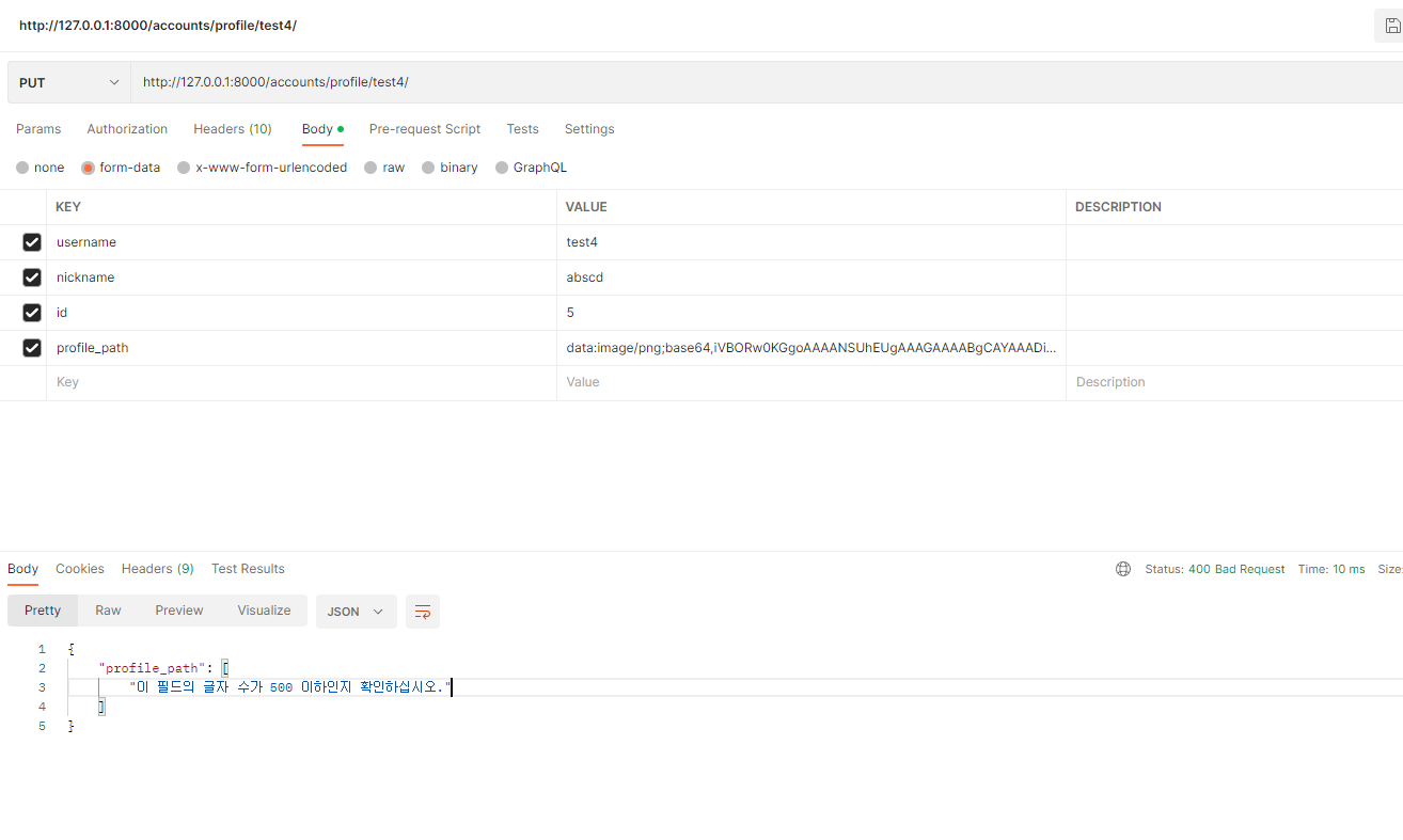 - 초반에 모델에 설계 할 때 profile_path필드의 max_length를 500자로 했는데,