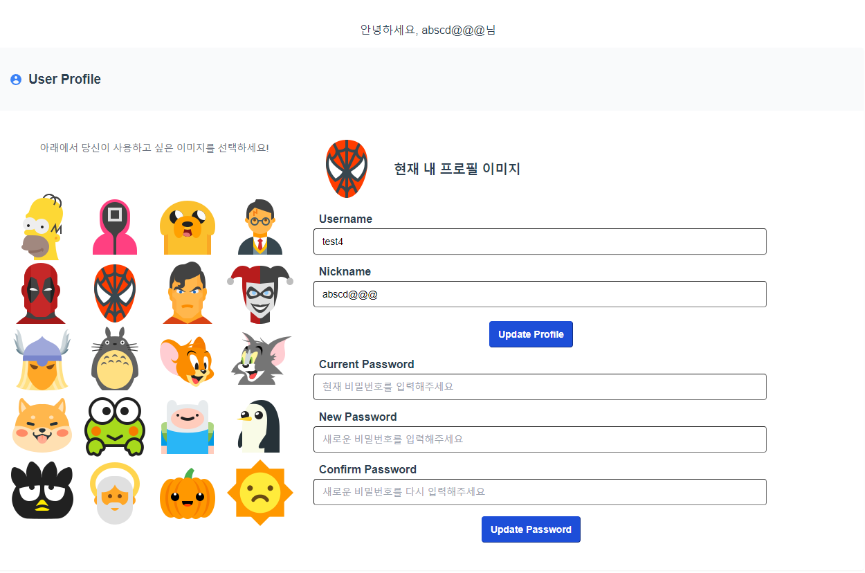 - 중요한 점은 몇개의 이미지를 제공하여 이미지를 클릭하면, 그 이미지의 src속성을 user의 profile_path로 수정해주는게 핵심이다.