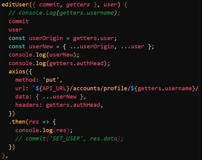- 정보 수정 함수는 메서드를 PUT으로 요청 보내고, 받은 정보를 다시 SET_USER로 정해주면 될 것같다.