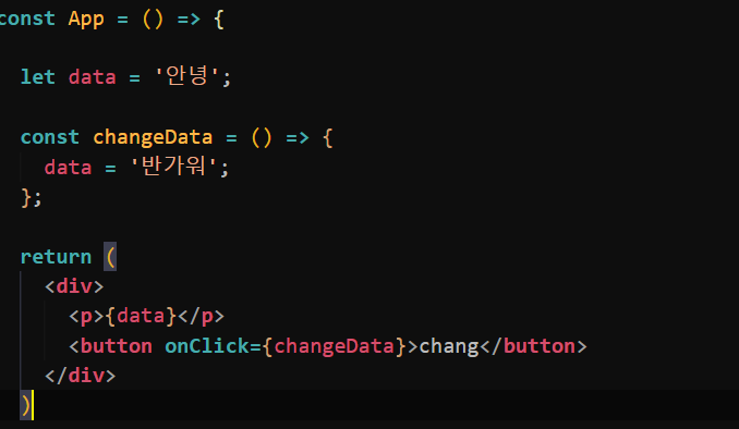- 이런 식의 코드가 있을 때 chang라는 버튼을 클릭하면 p태그 안의 data가 안녕에서 반가워로 바뀌고