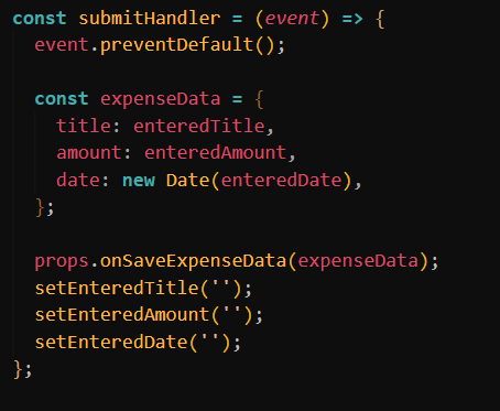 - expenseData라는 객체를 생성하여 세가지의 값을 모아주고 이를 props의 onSaveExpenseData라는 함수를 통해