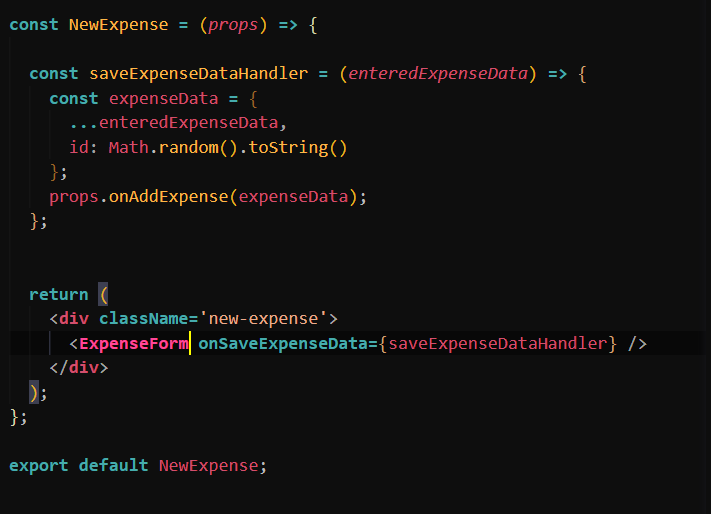 - 부모에 넘겨준다. 이 컴포넌트의 부모는 onSaveExpenseData의 함수를 자식한테 넘겨줬을 것이다.