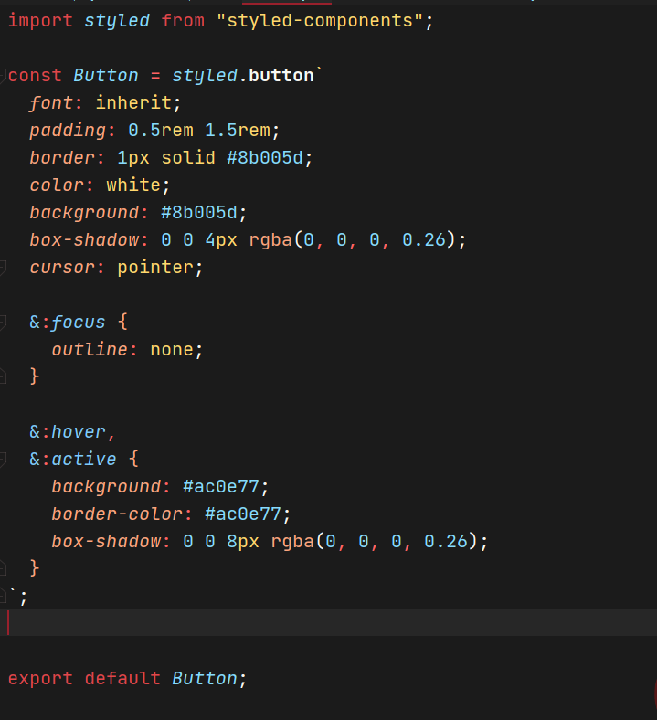 - 위는 Button이라는 컴포넌트에 다음과 같은 속성을 넣어 다른 곳에서는 여기서 정의한 스타일을 사용하지 못한다.