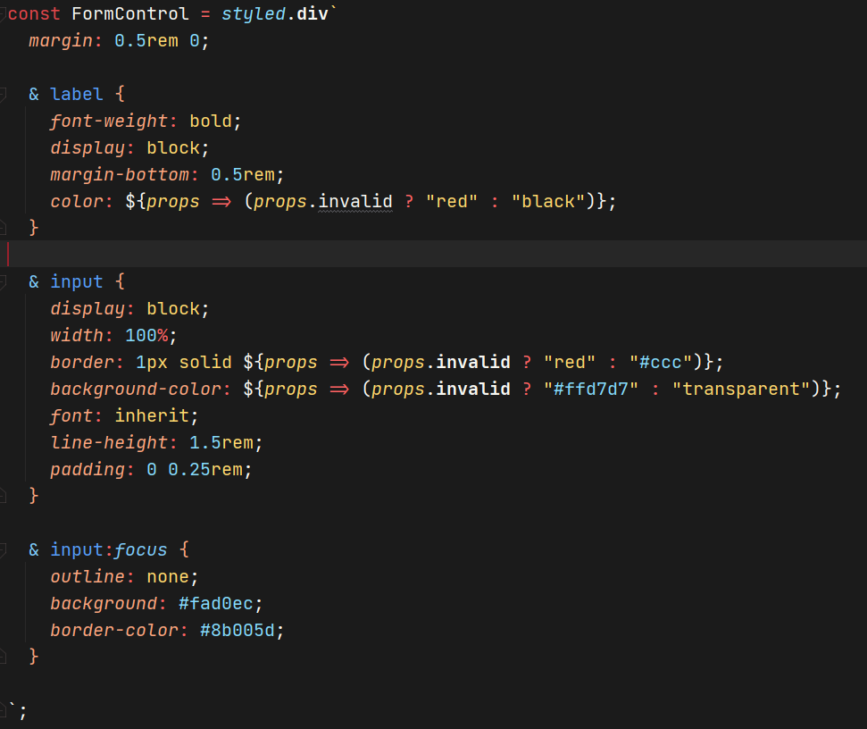 - 일단 다음과 같이 FromControl이라는 styled.div를 만들어 스타일을 준다.