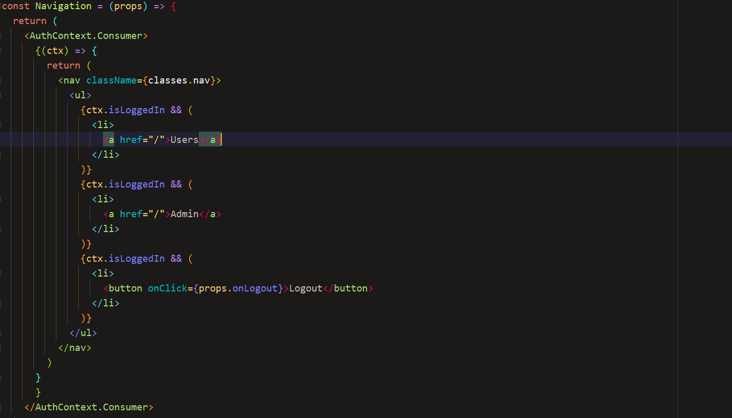 - 이 또한 사용하려는 컴포넌트를 <AuthContext.Consumer>로 감싸주고 return 값으로 jsx코드를 반환한다.