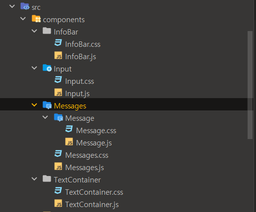 InfoBar, Input, Messages, TextContainer 폴더를 생성하고 다음과 같이 만들어준다.