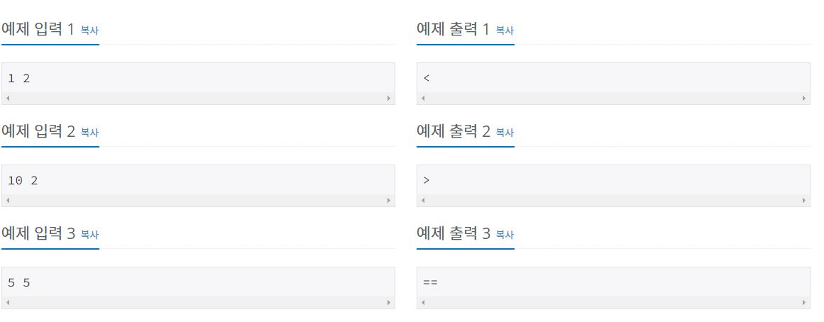 - A가 B보다 큰 경우에는 '>'를 출력한다.