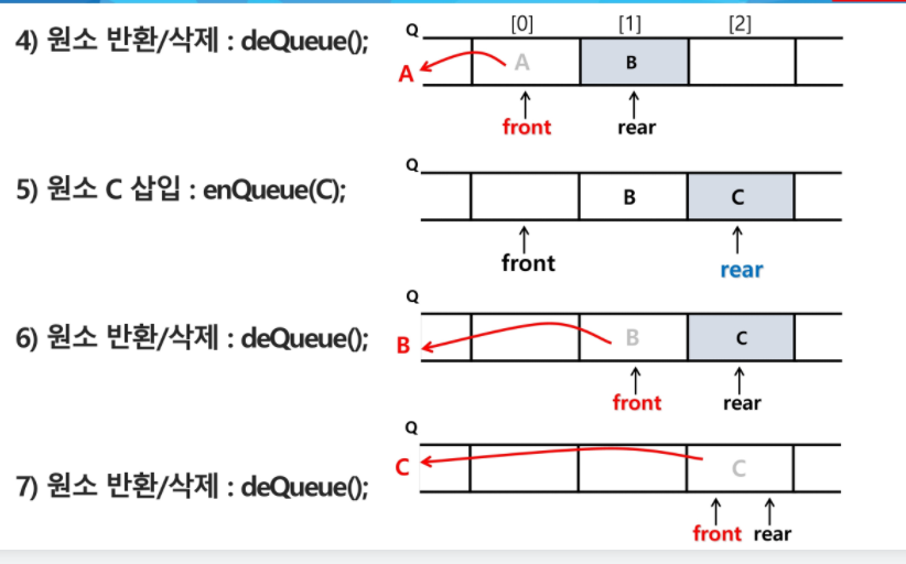 - Stack과 마찬가지로 원소를 삽입, 삭제할 때 Queue가 꽉찼는지, 비었는지 확인해야한다.